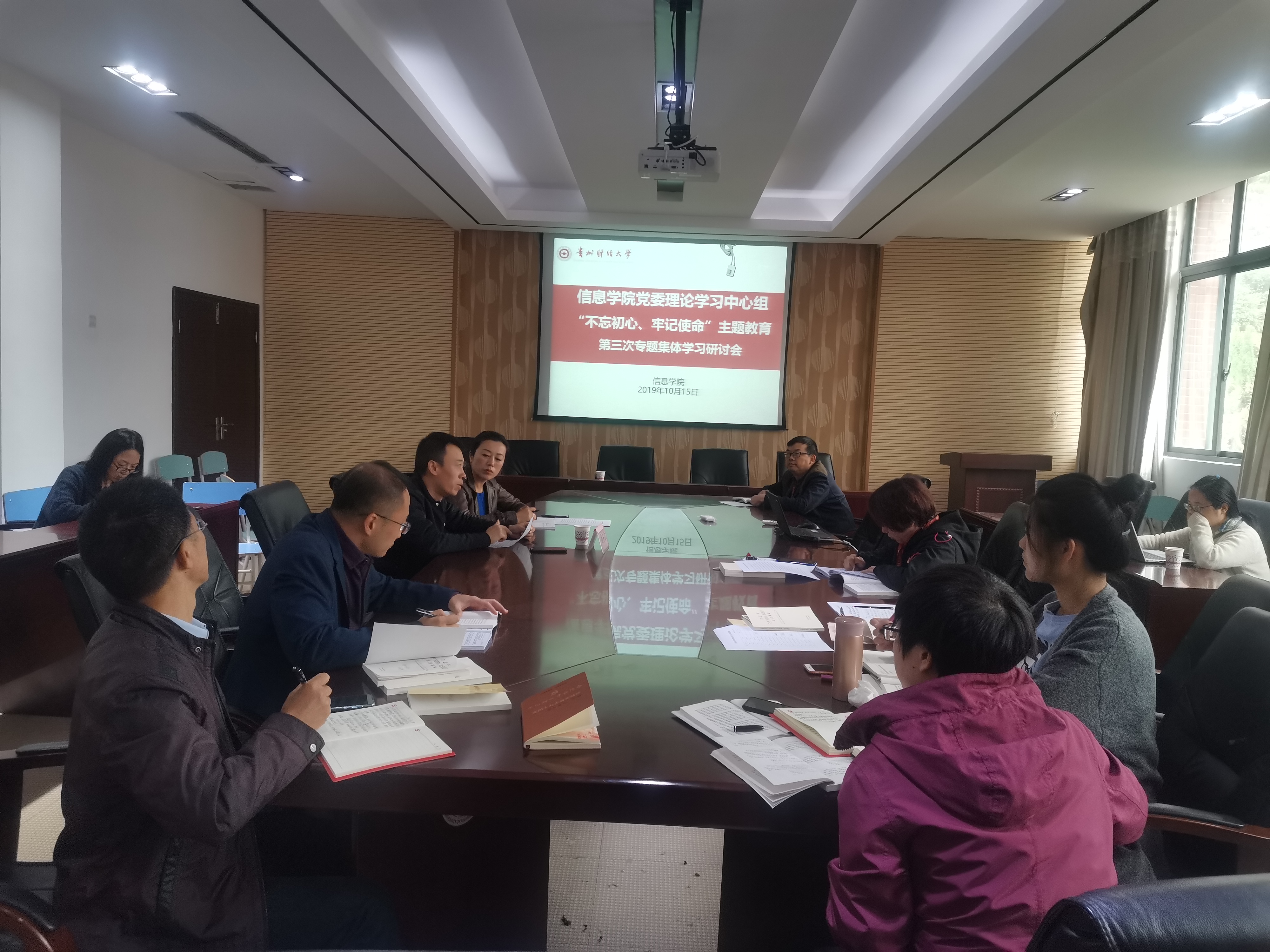 公司党委理论学习中心组于10月15日上午10点在志学楼427会议室召开“不忘初心、牢记使命”主题教育第三次专题集体学习研讨会,学院领导、各系(科室)负责人、党支部书记参会,卿春主持会议。